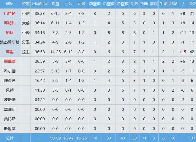 勇士全队数据如下: