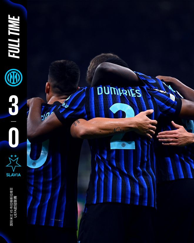 北京时间10月1日凌晨3:00,2025/26赛季欧冠联赛阶段第二轮主场对阵布拉格斯拉维亚。上半场劳塔罗抓对手失误破门,随后邓弗里斯扩大比分,下半场劳塔罗上演梅开二度,最终我们主场3比0战胜布拉格斯拉维亚,拿下3分!