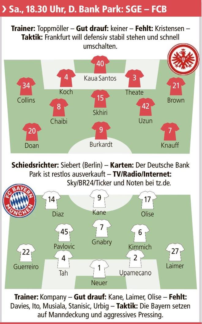 雷速体育10月4日讯 北京时间10月5日00:30,德甲第6轮,法兰克福坐镇主场迎战德甲领头羊拜仁慕尼黑,本场比赛开始之前,德国媒体《慕尼黑日报》预测了双方的首发阵容,拜仁慕尼黑由目前脚感火热的凯恩领衔,法兰克福方面会继续首发连场进球的土耳其小将詹·乌尊。